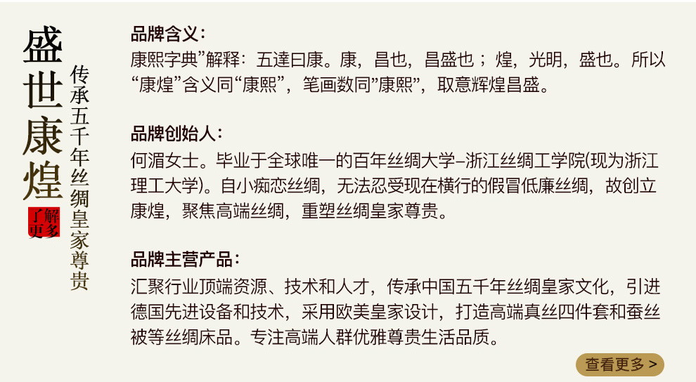 康煌定位高端真丝床品和真丝服装,重塑丝绸皇家尊贵。专注高端人群生活品质和生活品位。愿每一个康煌优雅奢华生活圈里的朋友,在康煌的陪伴下,生活更优雅,更高品位。