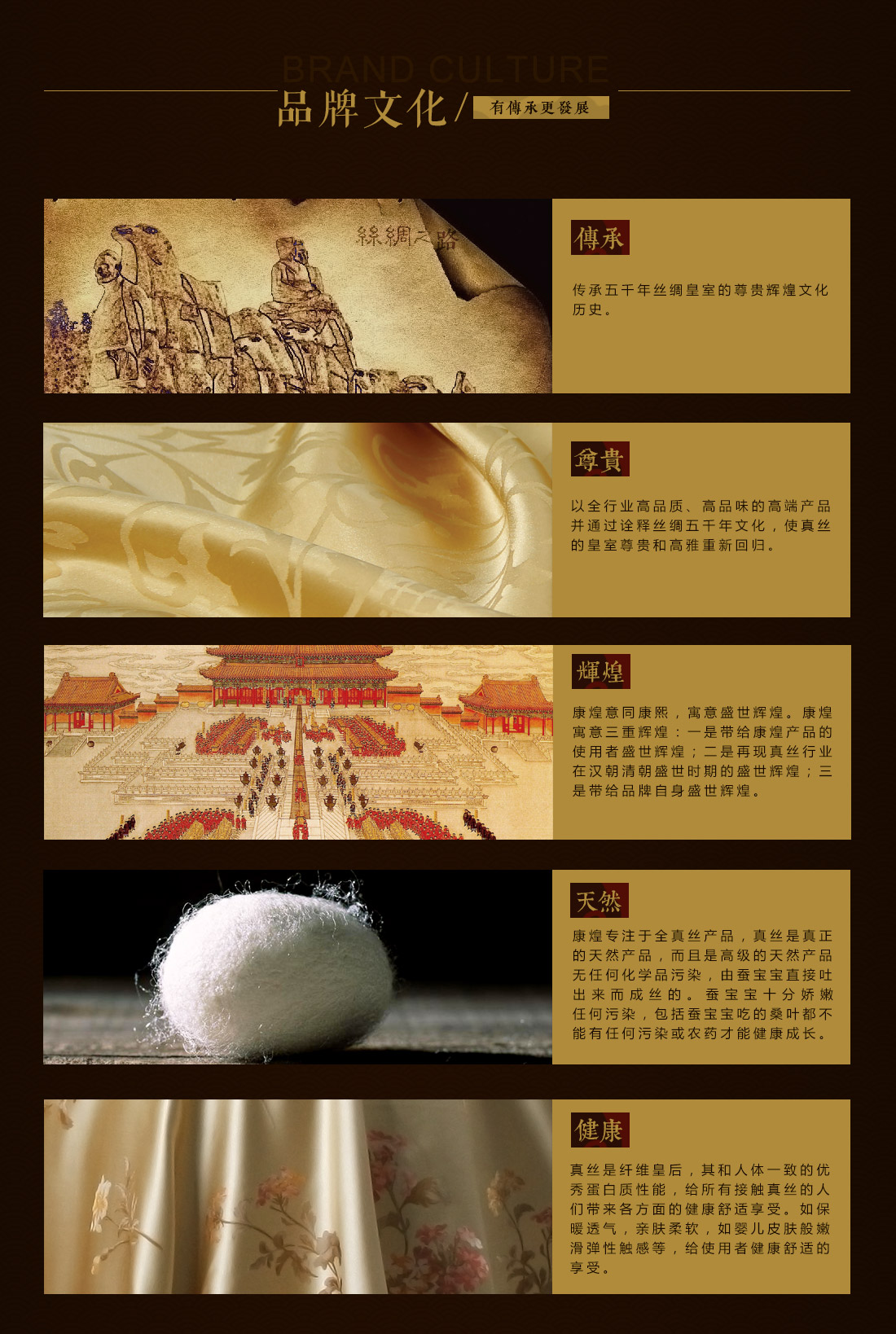 康煌定位高端真丝床品和真丝服装,重塑丝绸皇家尊贵。专注高端人群生活品质和生活品位。愿每一个康煌优雅奢华生活圈里的朋友,在康煌的陪伴下,生活更优雅,更高品位。